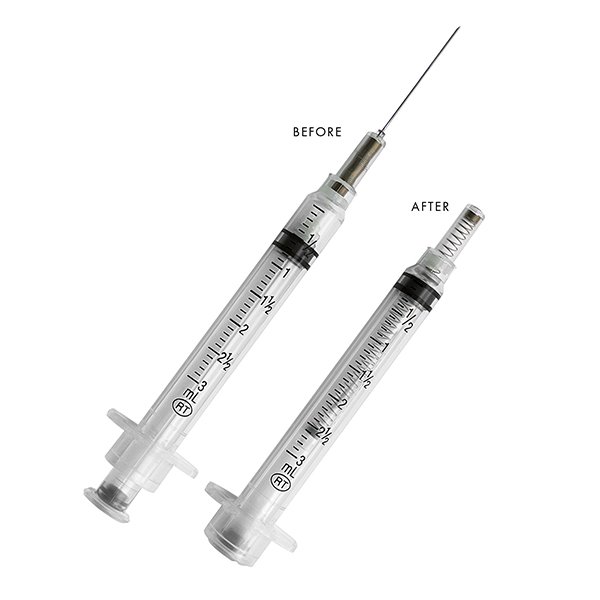 The needle is automatically retracted directly from the patient into the barrel of the syringe when the plunger handle is fully depressed. The pre-removal, automated retraction greatly reduces exposure to the contaminated needle, effectively reducing the risk of needlestick injury.